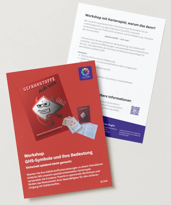 Medienpaket: Mit unserem praxiserprobten Workshopmaterial erhalten Sie ein vollständiges Set zur eigenständigen Durchführung einer Schulung zum Thema Gefahrstoffe – inklusive des Kartenspiels „Gefahrstoffe – Ach was“.